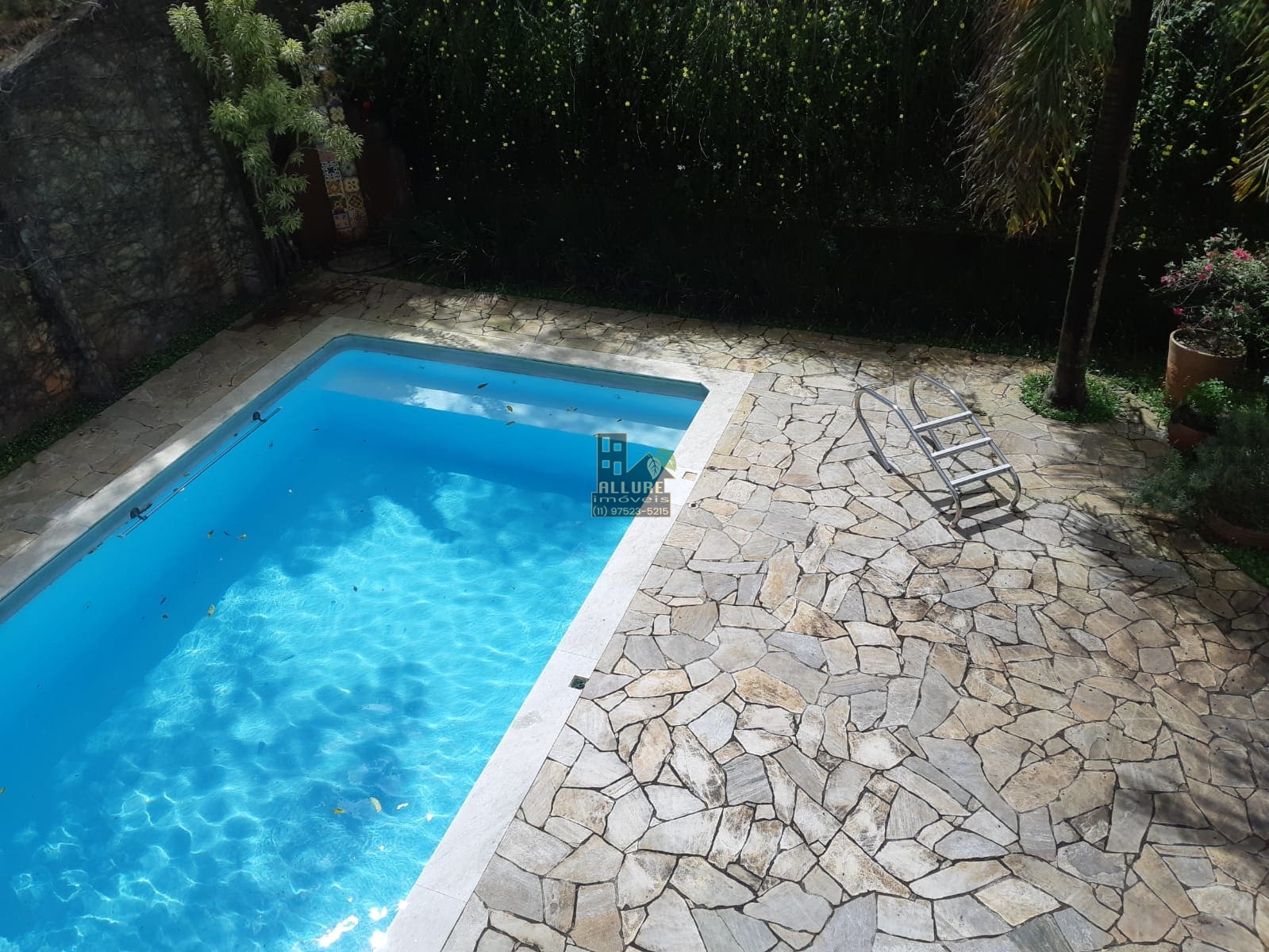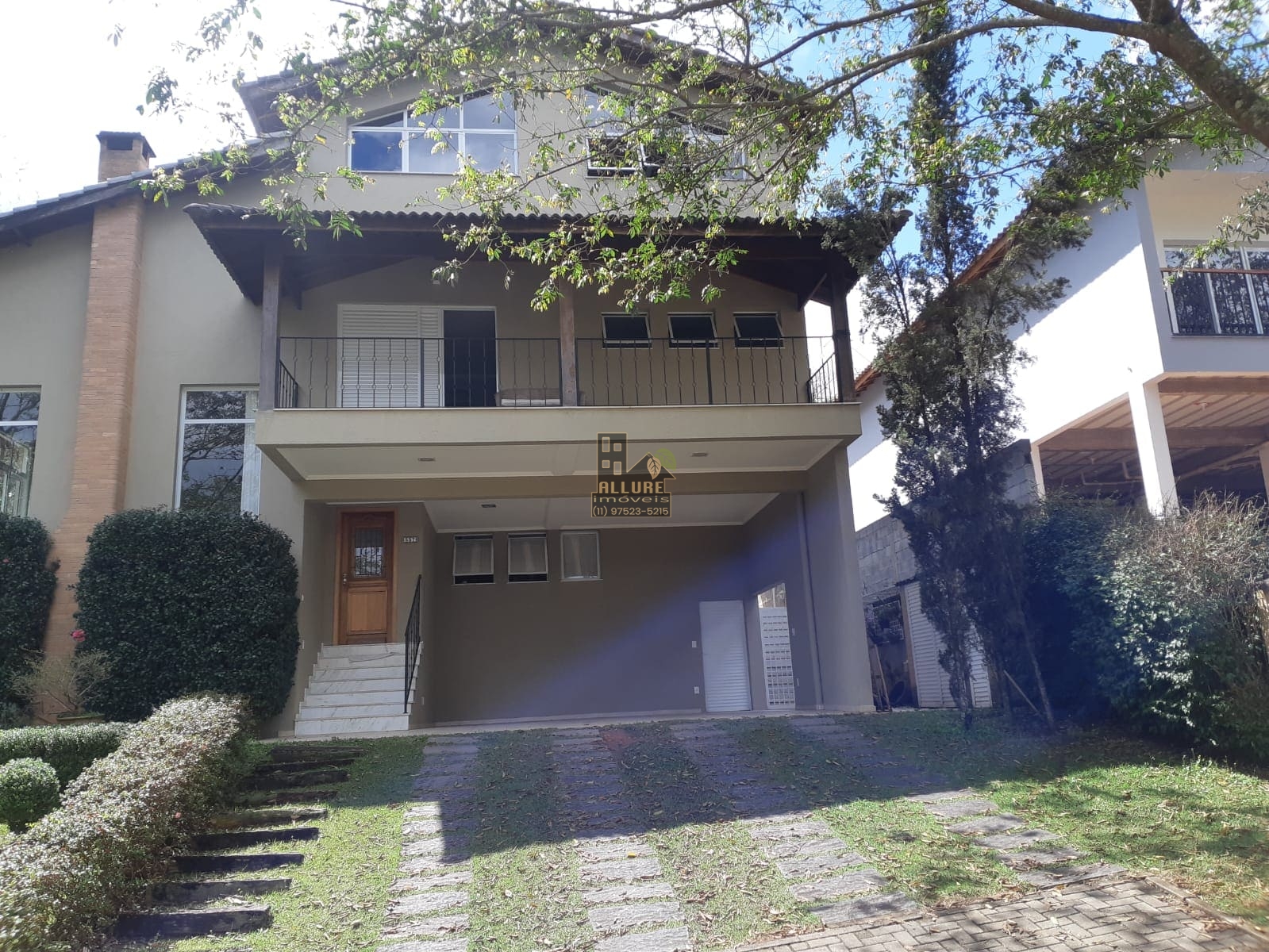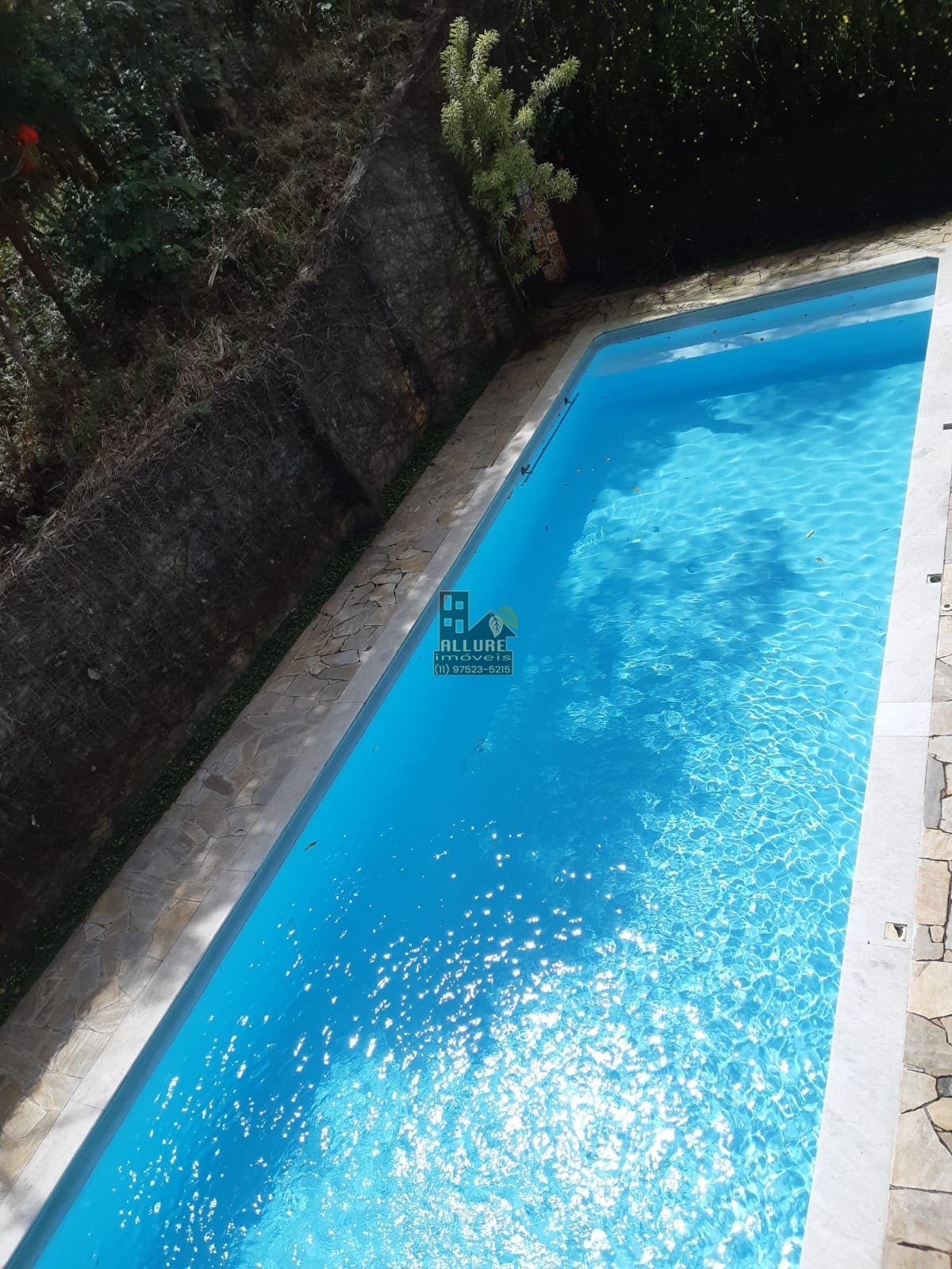 Sobrado com garagem para 02 veículos em cobertura, sala com lareira para curtir um vinho com a família e amigos, lavabo, sala de TV, adega, cozinha, despensa, uma linda piscina 4 x 12 próximo ao pergolado coberto por jasmim branco e excelente espaço gourmet com churrasqueira, fogão e forno a lenha.