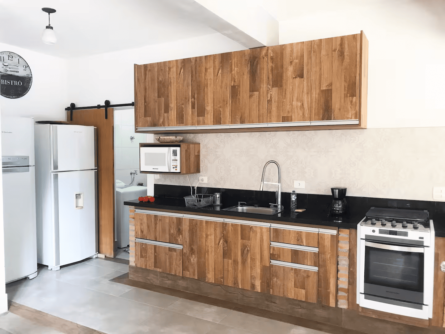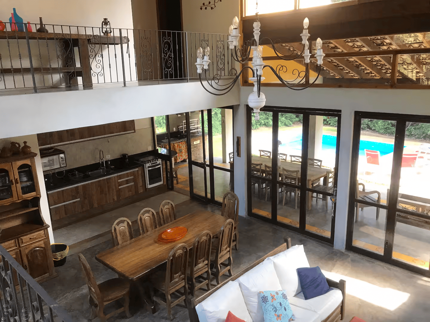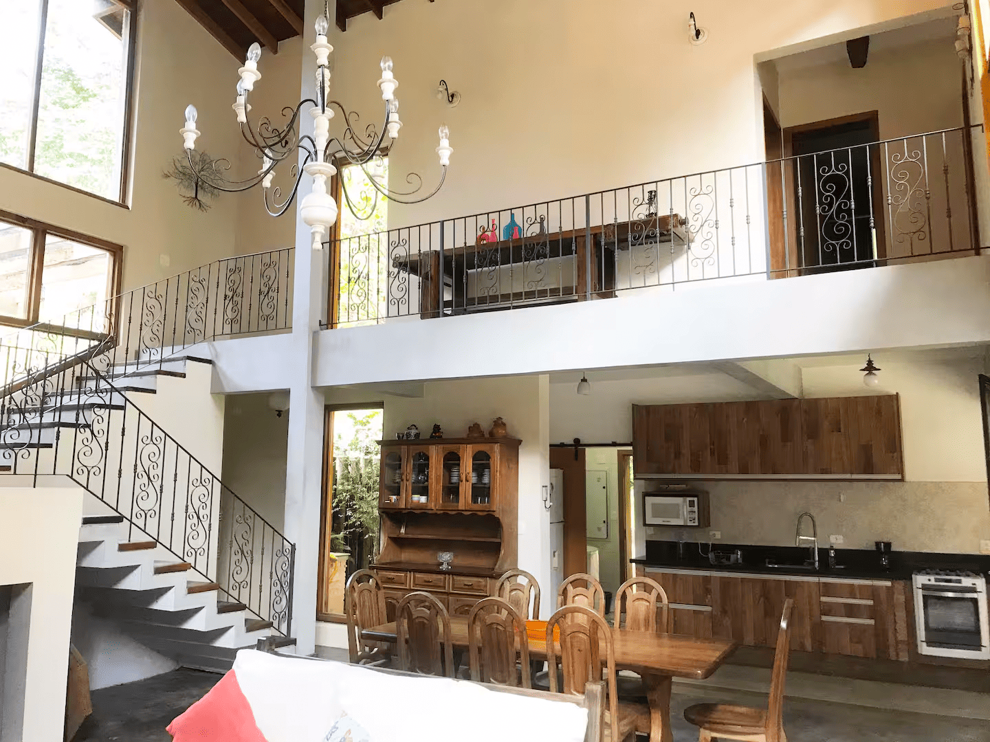 No térreo, duas suítes oferecem praticidade e conforto. No pavimento superior, dois dormitórios no estilo americano compartilham um banheiro, ideais para família ou hóspedes. A sala ampla com lareira é um convite para momentos aconchegantes, e a cozinha, com móveis rústicos, mantém o charme e a funcionalidade do espaço.
